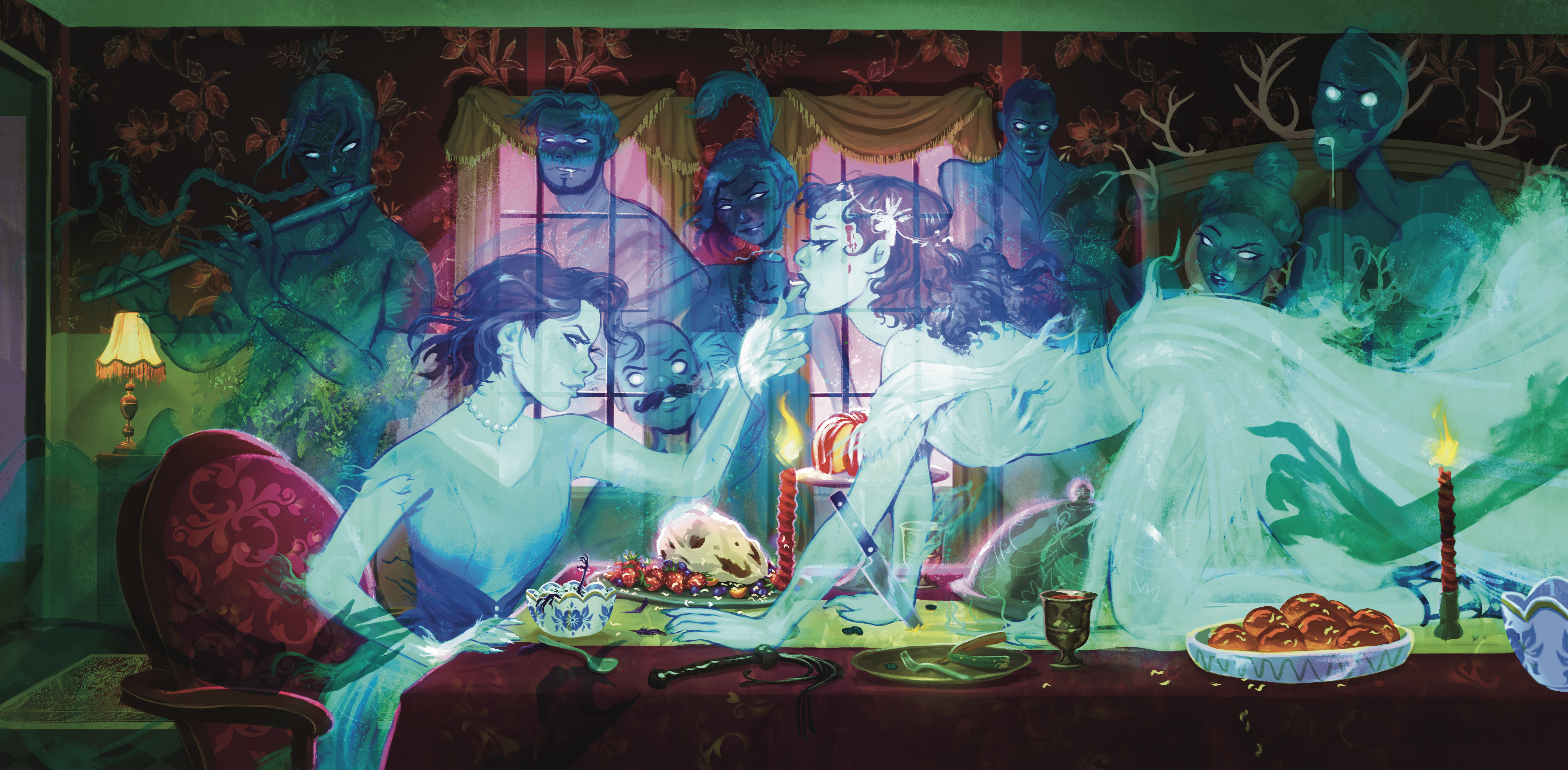 “Amber, love, there you are.” The gunshot at her temple is a ruby glisten, a spillage of pomegranate seeds. She twines her fingers in mine and, superimposed over the arch of her left zygomatic bone, the children of the house whisper between themselves. “Come, look what has arrived for tonight.”